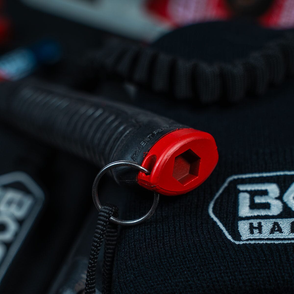 Now able to tether to the bottom of the handle to meet elevated work requirements.